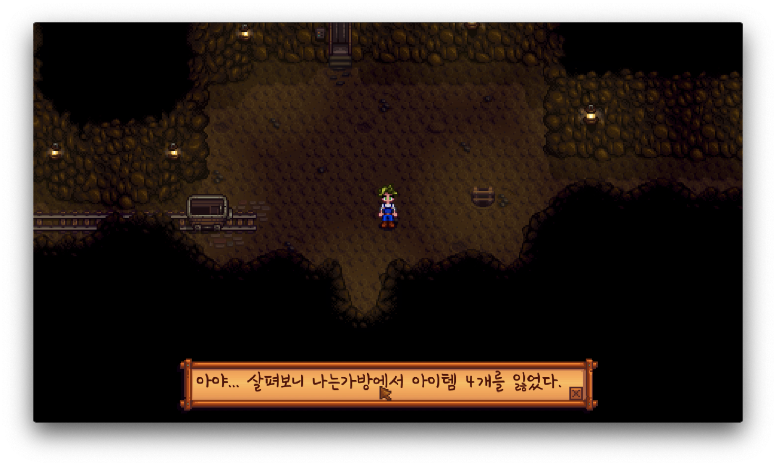 그래도 하루 전으로 돌아가는 건 아니었구나, 싶어서 다행이라고 생각했는데 아니 이게 무슨 일인가요. 아이템을 네 개나 잃어버렸답니다. 특히 무기를 잃어버린 건 정말 치명적이었어요. 광물을 캐려면 무기를 다시 사서 내려가야 하다니. 랜덤으로 잃어버린 아이템이 정해지는 것이겠지만, 무기는 좀 아깝고 아까웠어요.