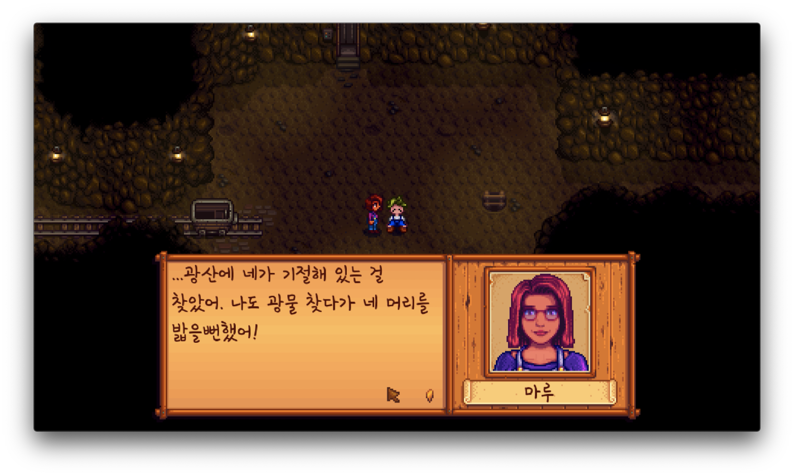 갑자기 어두워지는 화면, 이렇게 게임오버가 되는 건가?! 그래도 세이브파일이 있으니 하루 전으로 되돌아가지 않을까? 생각하고 있던 찰나에 누군가가 저를 부릅니다. 곧이어 배경이 밝아지고, 광산 입구로 돌아온 캐릭터의 모습이 보입니다. 옆에는 마을 주민 '마루'가 있어요. 제가 쓰러져 있던 걸 발견했다며 구해줬다고 합니다.