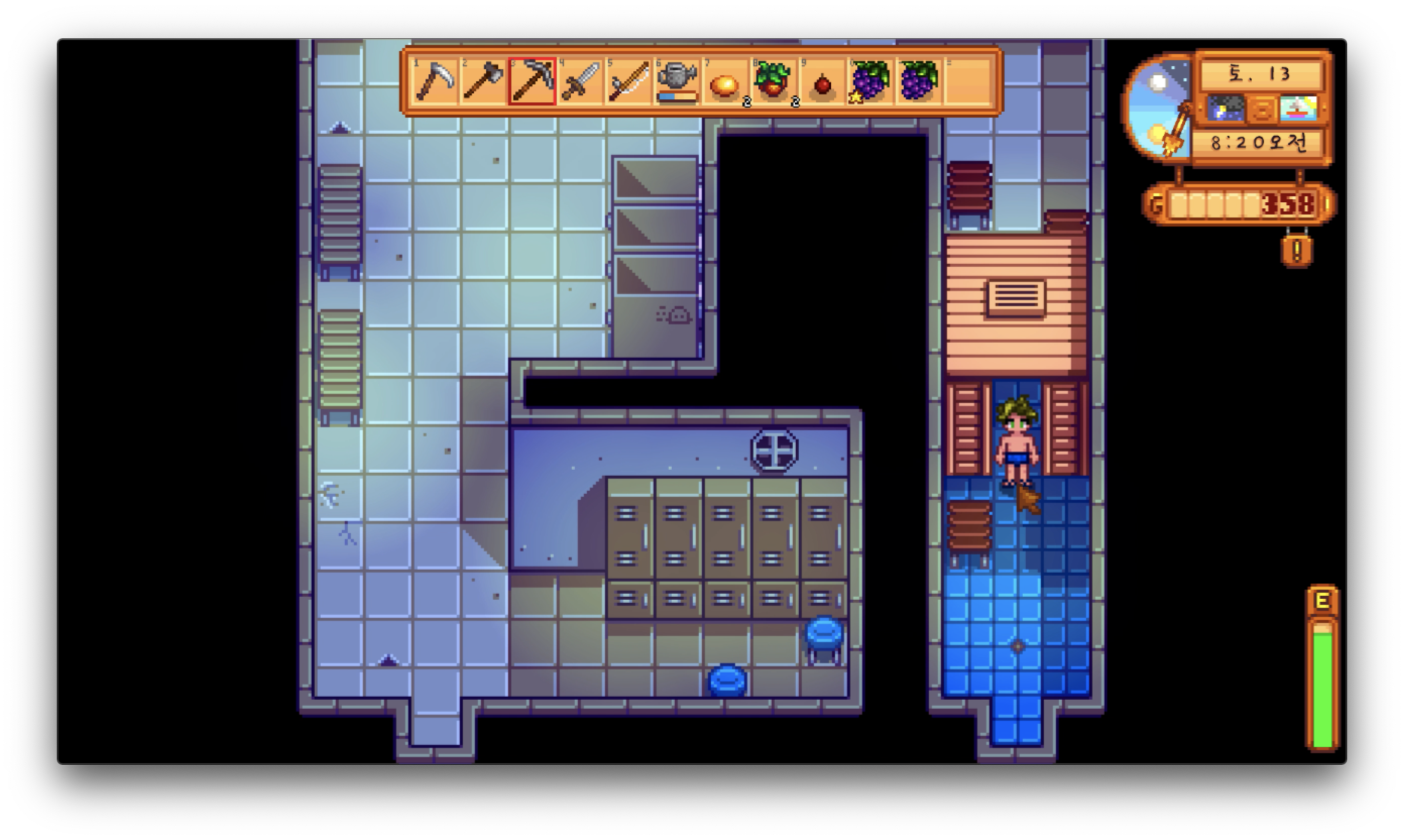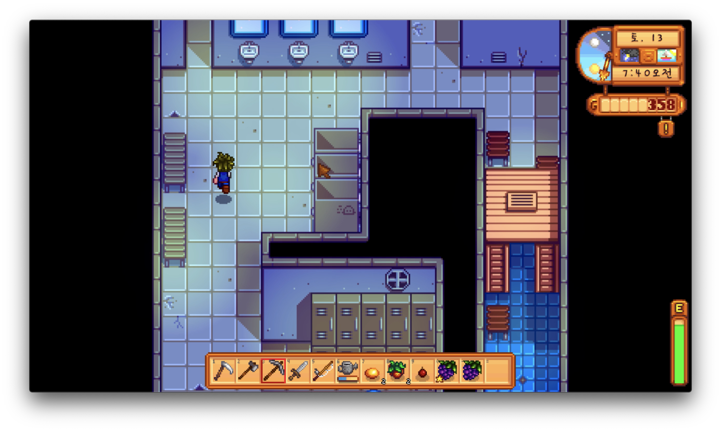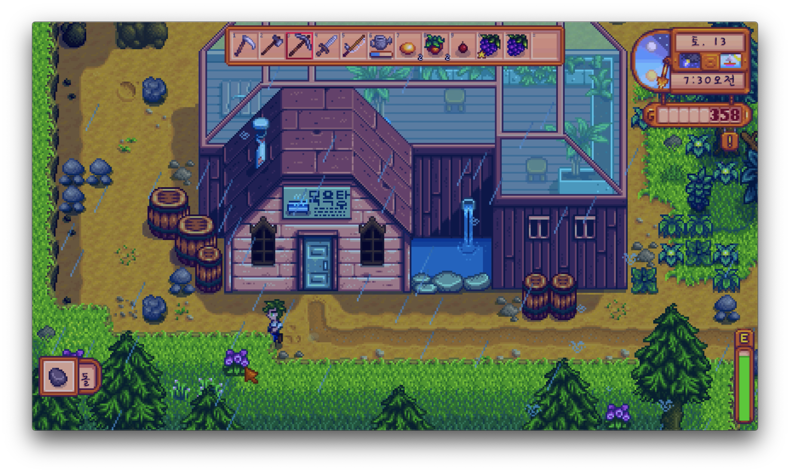 스타듀밸리는 활동할수록 에너지를 소모하는 시스템입니다. 나무를 베거나, 광물을 캐거나, 밭에 물을 주거나, 낚시를 하는 등등의 행위를 하면 우측 하단에 위치한 에너지 게이지가 줄어드는 걸 확인할 수 있어요. 그러나 이 에너지 게이지는 턱없이 부족합니다. 이른 아침부터 일을 시작한다면, 점심 무렵에는 에너지가 절반도 남아있지 않은 걸 볼 수 있을 거예요.