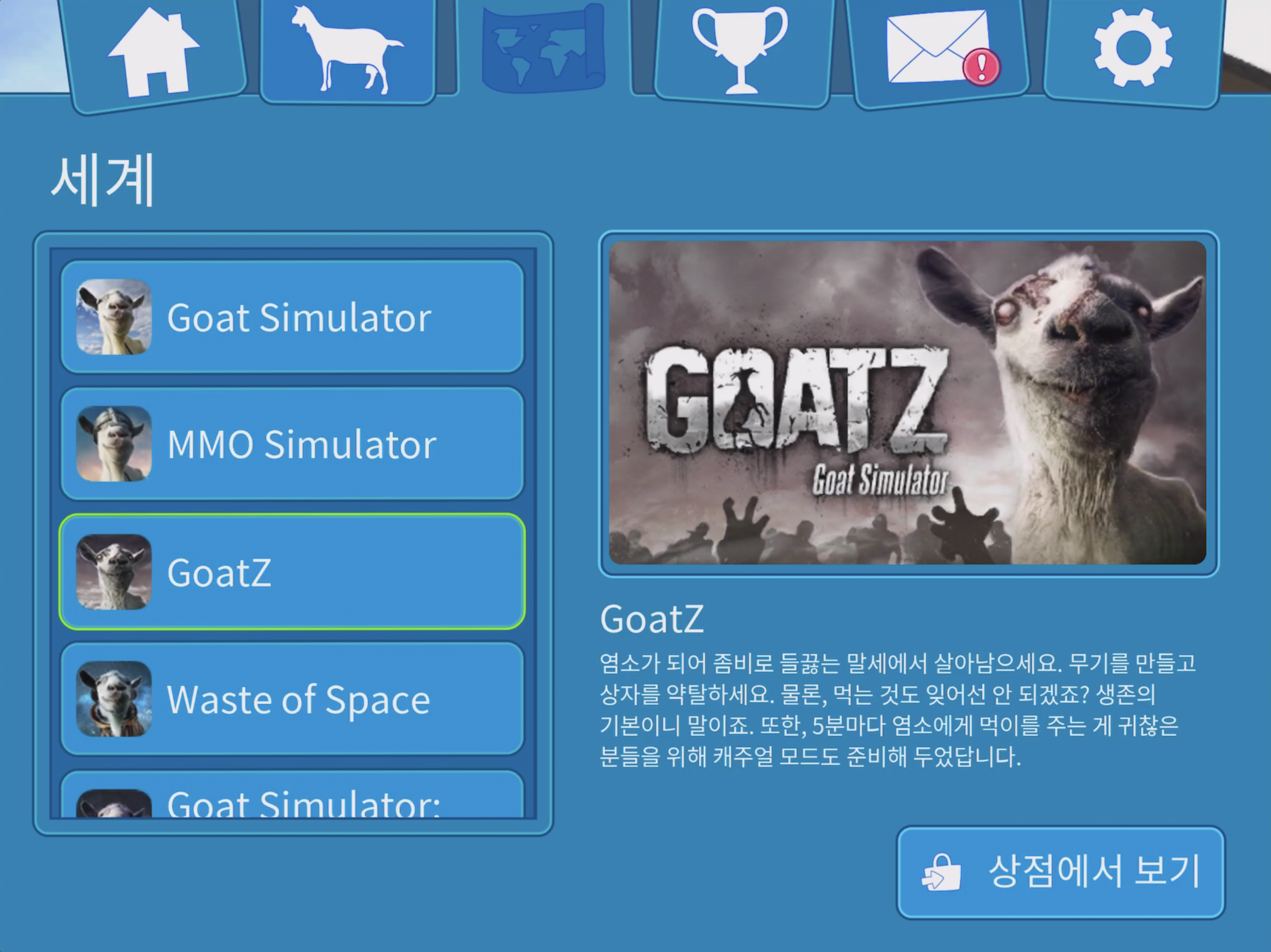 - 시리즈 있음, 앱 내 추가 구매 가능(염소 해제, 좀비 팩, 판타지 팩 등등)